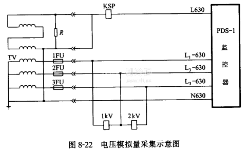 電壓流模擬量信號取自電壓互感器(TV)二次側。線電壓信號取L1-630,12-630, L.3-630三點。相電壓信號取L,-630,場-630,與-630,N630四點。零序電壓取自二次輔助線圈(開口三角)L630,N630兩點。如圖8-21~8-22所示。開關量輸入取自各保護繼電器無源干觸點。由各工程二次接線圖決定。監控器接線圖如圖8-23所示。