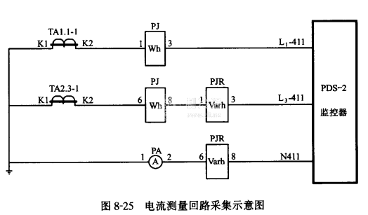 A.正常工作電流模擬量信號采集方法 正常工作電流最取自電源進線、出線、母聯回路中測里用的電流互感器((1 TA)二次側。可與有功電度表、無功電度表、電流表等申聯共用,其示意圖如圖8-24~8-25所示。