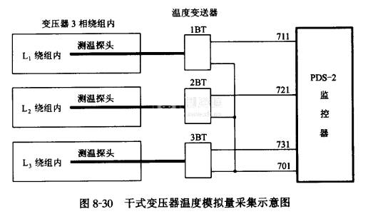 油浸式變壓器溫度模擬盆取自放在油箱內的感溫元件。干式變壓器溫度模擬量取自埋在L1,L2,L3三相繞組內的熱敏電阻或鉑熱電阻。測量溫度經變送器將溫度信號轉換為0~20mA直流信號提供給監控器。也可采用智能溫度變送器直接轉換為數字信號輸入監控器。不過目前智能溫度變送器價格較高。油浸式變壓器溫度信號采集如圖8-29所示。干式變壓器信號采集如圖8-30所示。