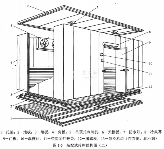 裝配庫的庫體采用工廠按標準模數生產的底板、側板、頂板、庫門等組裝而成,如圖1-4至圖1-6所示,裝配庫可按庫板模數改變組裝尺寸,根據需要搭配組合,適應性強,容易裝、拆搬遷,為活動性冷庫,裝配庫按庫容量大小分別配有全套的制冷機器和設備。