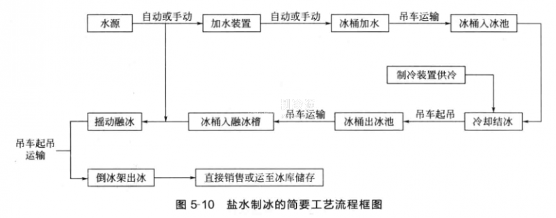 脫冰后的空冰桶經注水后再放入制冰池中繼續生產。因此鹽水制冰成套設備包括了制冷循環部分和制冰設備部分。鹽水制冰的簡要工藝流程框圖如圖5-10所示.鹽水制冰工藝流程如圖5-11所示。