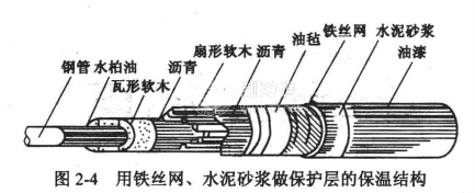 1.直管段的保溫施工。直管段的保溫結(jié)構(gòu)由里到外有:瀝青涂層、保溫層、重復(fù)瀝青涂層、保溫層至需要一定的厚度敷油氈、瀝青層、捆鍍鋅鐵絲網(wǎng)、水泥砂漿抹面、刷油漆,為了保證保溫層能與管子緊貼,對于管徑較小的管子,保溫材料應(yīng)制成半圓形后敷設(shè),或者內(nèi)層敷半圓形保溫層,外層敷扇形保溫層,如圖2-4所示。
