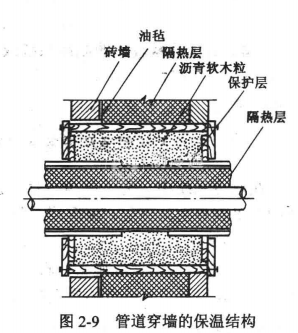 2.管道穿墻和穿樓板的保溫施工。制作的保溫結(jié)構(gòu)既要防止發(fā)生“冷橋”,、也要保證固定牢靠,如圖2-8和圖2-9所示。