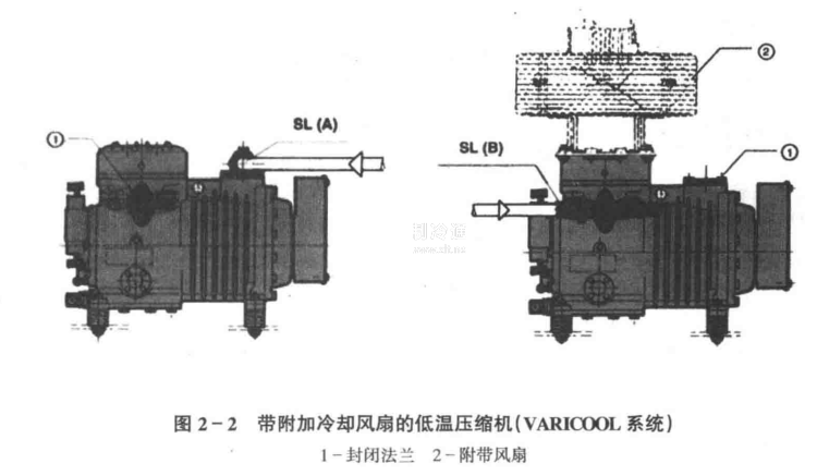 一些壓縮機在實際使用中可以適用于不同的工作溫度,在通常的食品冷藏溫度范圍內可以采用吸氣來冷卻電機的方式,而在制取較低溫度范圍內則可以采用在氣缸頭上加裝通風機來實現強化外部通風的方式對機體進行冷卻。由BI'I-ZER公司提供的專門為R22而發展的VIRIOOOL系統,不僅可采用制冷劑的吸氣對電機進行冷卻,也可以同開啟式壓縮機一樣,制冷劑氣體直接進人壓縮機的氣缸,而不需要采用吸氣對壓縮機的電機進行冷卻。在直接吸氣的工作方式中,電機線圈所散發的熱量沒有傳給低溫的制冷劑氣體,這樣可以減少制冷機的吸氣過熱,由此可以降低潤滑油的溫度,降低制冷劑的排氣溢度。這兩種冷卻方式的轉換可以通過簡單的改變吸氣單向閥的位置來實現(如圖2一2所示,從位置“SL(A)”向“SL(B)”轉換)。使用V IRICOOL壓縮機的制冷櫥柜,對于蒸發溫度在一5℃~一45℃變化時,只需應用同一臺壓縮機,即可滿足不同溫度的需要,這樣可以使用戶根據實際情況存儲不同的食品,同一臺商業制冷櫥柜可以達到不同的溫度要求,擴展了商業制冷櫥柜的使用范圍。圖2-2為VIRI-COOL系統帶冷卻風機的壓縮機外形圖。