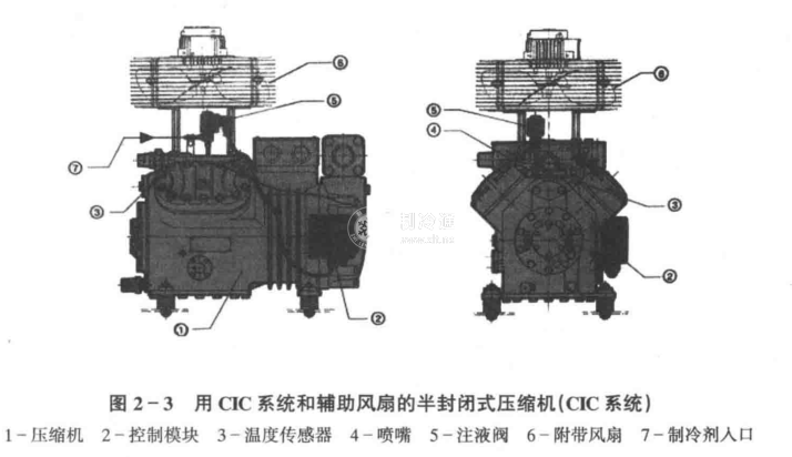 在使用功率較大的單級半封閉式壓縮機的R22低溫制冷系統中,隨著功率的增加,制冷劑從蒸發器和壓縮機帶走的熱斌也增加.此時單獨采用通過外部通風來冷卻機體不能達到較好的冷卻效果,在制冷劑進行電機冷卻的同時,把外部通風和控制制冷劑噴射結合起來。如BITZER公司為單級半封閉式壓縮機提供的CIC系統,如圖2一3所示。當壓縮機的排氣溫度超過某一額定值時,通過一個專門的噴嘴將制冷劑液體噴人到壓縮機的吸氣腔。制冷劑液體吸收了熱的吸氣腔的熱量而蒸發,使吸氣腔被冷卻,同時使制冷劑的吸氣(過熱)溫度下降。由一個注液閥來準確定量噴入制冷劑液體,通過溫度傳感器測量壓縮機的排氣溫度,根據壓縮機排氣溫度的高低來進行控制。當排氣溫度超過某一位后,向吸氣腔噴入液體,而當排氣溫度下降至某一值時,噴射自動中斷。在電機冷卻不足或者在任何異常的工作條件下,壓縮機都會自動進行安全斷路。