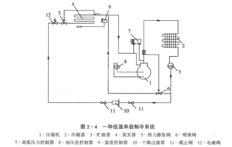 在低溫單級制冷系統中除了使用上述帶CIC系統的低溫壓縮機以外,在制冷系統中還可使用如圖2一4所示的一種低溫單級制冷系統的流程。因為低溫制冷系統制取的蒸發溫度較低,系統運行時壓縮機的壓力比較大,引起壓縮機排氣溫度過高,而系統中使用的低溫壓縮機本身帶有附加電機冷卻設施,保證排氣溫度在允許的范圍之內。在制冷系統中采用在吸氣管路加噴液的方法。圖中6為噴液閥。從貯液器(或冷凝器)來的制冷劑高壓液體,經噴液閥節流降壓,低溫液體制冷劑噴淋在吸氣管路中,利用液體的蒸發降低壓縮機吸氣的制冷劑溫度。噴液閥是根據排氣溫度的高低來自動控制其開度的,噴液閥的感溫毛細管纏繞在排氣管路上,當排氣溫度超過設定值時,噴液閥就打開。安裝時應嚴格控制在吸氣管路上連接噴液管的位置,應距壓縮機的吸入口一定距離,以免液體制冷劑沒有完全蒸發就被壓縮機所吸入造成壓縮機液擊。