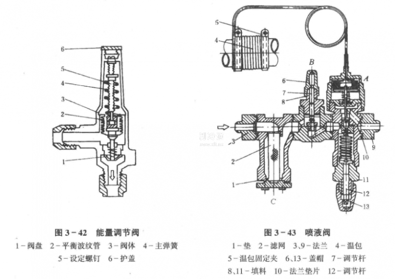 噴液閥的結構如圖3一43所示。它是由噴液調節閥A、手動節流閥B和過濾器C組成。噴液調節閥的工作原理與熱力膨脹閥相似,其作用是根據排氣溫度來調節液體的噴人量。根據制冷系統中所用制冷劑的不同,可以設置相應的排氣溫度所對應的壓力值,作為閥的開啟壓力值,在閥上預先調定好。一般R22的開閥溫度的調定值為80℃,調節范圍為50℃一110℃;
