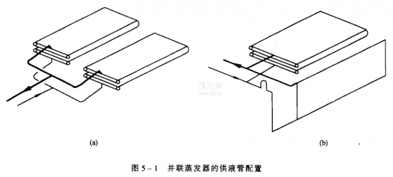 3、并聯于一根供液管的蒸發器,應考慮到沿程阻力對供液量的影響,對各并聯供液的蒸發器,要求其當量長度基本相等,以保證每組蒸發器都有良好的制冷效果。如可采用中進中出,選進后出的方式。如圖5-1(a)所示。