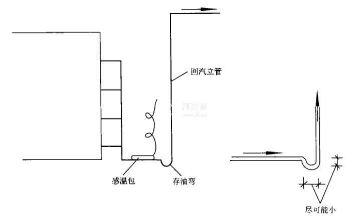 1、 設(shè)置上升立管和回油彎對所系統(tǒng)除考慮必要的帶油速度外,還應(yīng)考慮吸汽上升立管的必要的帶油條件。一般在上升立管的下部 設(shè)置一個(gè)存油彎,在重力的作用下,使?jié)櫥头e存在油封內(nèi),油封形成后,潤滑油在油封前后的壓力差推動(dòng)下前進(jìn) ,油封過大,會使制冷機(jī)的吸汽壓力過份降低,于制冷系統(tǒng)的運(yùn)行不利,所以油封不宜過大,上升立管下部 要建立油封,又要使油封最小,同時(shí)在蒸發(fā)器出口近側(cè)必須伸出一段坡向與制冷劑流向一致的水平短管,用以安裝熱力膨脹閥的感溫包,然后再設(shè)存油彎。上升立管的油封結(jié)構(gòu)見圖5-23。
