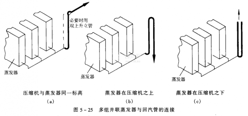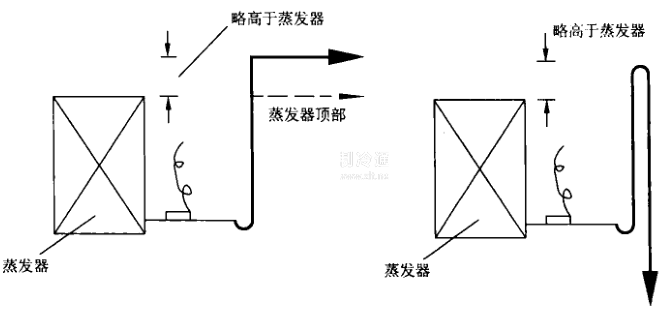 核心提示:當(dāng)回汽管與一組蒸發(fā)器連接,且壓縮機(jī)與蒸發(fā)器位于同標(biāo)高或蒸發(fā)器高于壓縮機(jī)時(shí),為防止系統(tǒng)停止運(yùn)行時(shí)液體進(jìn)入壓縮機(jī),造成再啟動(dòng)時(shí)液擊,在蒸發(fā)器出口側(cè)應(yīng)將上升立管上升至蒸發(fā)器頂部或略高于蒸發(fā)器,再接至壓縮機(jī)
