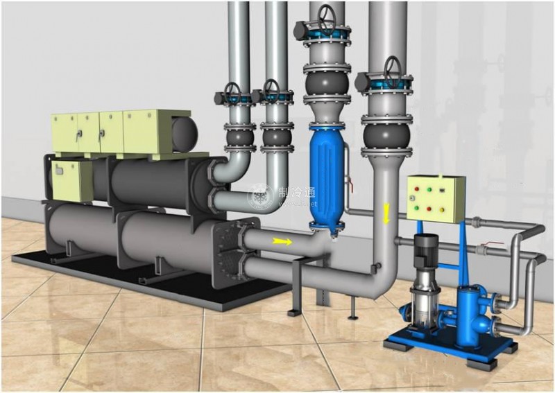 (3)立式殼管式冷凝器應安裝在室外,并離機房出入口較近的地方,其水池壁與機房或其他建筑物的墻面距離一般不能小于3000mm,以減少冷卻水外濺而損傷墻面。