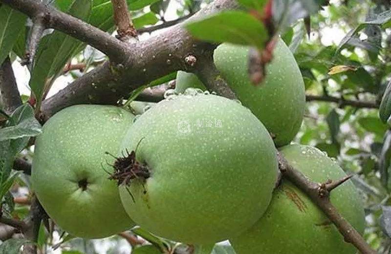 此紅棗制冷保鮮方法的工藝是采集成熟度為半紅期的完好棗果,分品種裝入聚丙烯塑料袋中,但不要封口,然后將棗果袋放在距紫外燈管(能量2.4kJ/㎡ )5-20cm處,輻照2~4min。經紫外線輻照的棗果袋裝箱后,放入5℃的冷藏庫內3~5d;進行預冷。再按不同果型品種采取分低溫區段貯藏,如中小型的品種在-2~2℃的庫溫下存放,對大果型的品種為0~3℃,在貯藏中定期檢查,去除貯藏過程中的腐爛果,分脆果、軟果裝入聚丙烯袋中。密封包裝后再次用紫外線輻照,輻照方法同前,裝箱后即可上市供應。