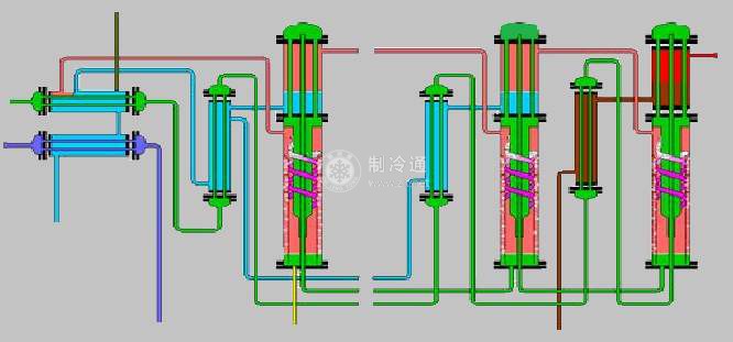 高壓發生器中產生的制冷劑水蒸氣,通過管道經過低壓發生器,在低壓發生器中加熱溶液后,凝結為制冷劑水,經沿途的流動降壓后進入冷凝器,部分閃發的水蒸氣與低壓發生器中產生的制冷劑水蒸氣一起被冷凝器管內的冷卻水冷卻,凝結為冷凝壓力下的制冷劑水。制冷劑水經管道或其他裝置節流后進入蒸發器。由冷劑泵輸送,噴淋在蒸發器管簇外面,吸取管簇內冷凍水的熱量,在蒸發壓力下蒸發,使冷凍水溫度降低,達到制冷的日的。蒸發器中產生的制冷劑水蒸氣流入吸收器,被進入吸收器的濃溶液吸收成為稀溶液,稀溶液由溶液泵經低溫溶液熱交換器和高溫溶液熱交換器進入高壓發生器,在發生器內發生。完成了雙效制冷循環的制冷劑回路。