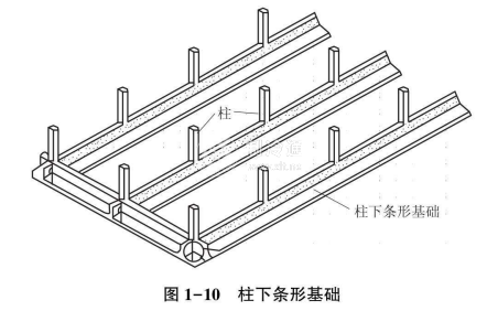 (1)柱下條形基礎。當荷載較大、地基較軟時,所需各單獨基礎的底面積很大,各個基礎非常接近,以致基礎之間距離很小。這時,就可將各個單獨基礎連接起來,即成為柱下條形基礎。如圖1-10所示。