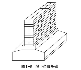 這種基礎通常用灰土、毛石、磚、三合土或混凝土等材料建造,但地基土允許承載較小而荷載又較大的一些建筑物的基礎也常采用鋼筋混凝土建造。條形基礎如圖1-8所示。