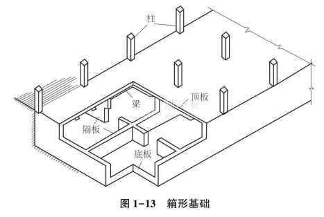 (4)箱形基礎。這種基礎是由頂板、底板、梁和縱橫交叉的隔板所組成的。板的厚度由計算確定。箱形基礎具有很大的剛性,因此,不致由于地基不均勻變形而使上部結構產生較大的彎曲而造成開裂,其構造如圖1-13所示。聯合基礎均采用鋼筋混凝土建造。