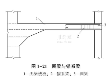 3)圈梁 冷庫的外墻雖然不承受其他荷載,但高度較大,多層冷庫可高達幾十米。為了增加墻體的穩定性,在外墻高度方向上每隔一定距離做一連續不斷的圈梁加固。圈梁的位置除頂層墻頂和基礎頂面設置外,一般每層設一道,標高與樓板平,并用錨系構件與樓板拉結。如圖1-21所示。