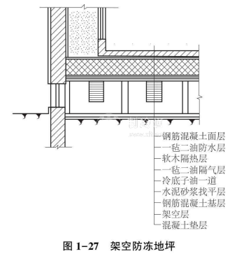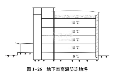 將不會引起土壤凍結的高溫庫布置在低溫庫的底層,這是目前大、中型多層冷庫普遍采用的一種方法,適用于地下水位較低的地區,其地下室構造簡單,只做一般防水處理即可。但在地下水位較高的地區,地下室的防水處理比較復雜,投資大,而且難以保證,故不宜采用。如圖1-26所示。