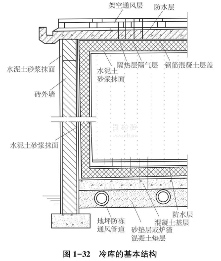 冷庫的基本結構如圖1-32所示。土建式冷庫結構應有較大的強度和剛度,并能承受一定的溫度應力。在使用中不產生裂縫機變形。冷庫的隔熱層除具有良好的隔熱性能且不生“冷橋”外,還應起到隔氣防潮的作用。庫的地坪通常應做防凍脹處理,冷庫的門應具有可靠的氣密性能。