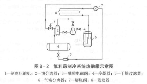 熱制冷劑除霜也叫作熱沖霜,是一種適用于直冷式和間冷式制冷系統的除霜方式。熱制冷劑除霜原理是:除霜時,壓縮機排除的高溫過熱制冷劑蒸氣,經油分離器分離后,通過切換控制閥門或電磁四通閥,將高溫過熱制冷劑蒸氣導入蒸發器內。利用高溫過熱制冷劑蒸氣的熱能融化蒸發器表面的箱層。圖9一2為氟利昂制冷系統熱融霜示意圖。