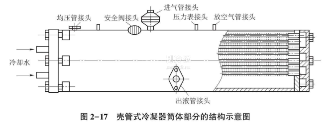 殼管臥式冷凝器水平放置,其結構如圖2-17 (a)所示。在這種冷凝器中,制冷劑的蒸氣是在管子外表面冷凝,冷卻水是在泵的作用下經管內流過。制冷劑蒸氣從上部進入筒殼內,凝結成液體后由筒殼的下部流入儲液器中。