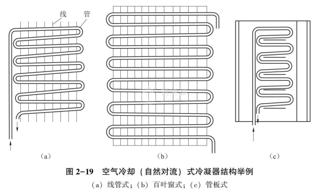自然對(duì)流式空氣冷卻式冷凝器,依靠空氣受熱后產(chǎn)生的自然對(duì)流,將制冷劑釋放出的熱量帶走。圖2-19所示為幾種不同結(jié)構(gòu)形式的自然對(duì)流空氣冷卻式冷凝器,其冷凝管多由紫銅管或表面鍍銅的特制鋼管制成,管子的外徑為5~8 mm,管外通常裝有各種型式的肋片。這種冷凝器的傳熱系數(shù)很低,為5~10W/(m2·K),其主要用于家用冰箱和微型制冷裝置。