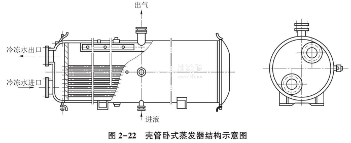 殼管臥式蒸發器的結構如圖2-22所示,這種蒸發器的結構形式與臥式冷凝器基本相似,工作時殼體內應充裝相當數最的制冷劑液體。一般其靜液面高度為殼體直徑的70%~80%,所以也稱為滿液式蒸發器,蒸發后的蒸氣從上部引出。載冷劑(水或鹽水)的進出口設在同一端蓋上,從下方流入,在蒸發器管子及端蓋中往返流過多次,再從上方流出。臥式殼管蒸發器在殼體下部有集污器,以便將沉積的潤滑油及其他雜物由此排出。