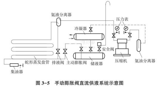在直流供液系統中,氨液通過節流膨脹后直接進入蒸發器蒸發,圖3-5所示為手動膨脹閥直流供液系統示意圖。氨液通過手動膨脹閥由下向上進入蛇形蒸發盤管,蒸發后經氨液分離器進入壓縮機,經過壓縮機,在氨油分離器中除去從氣缸帶來的潤滑油,然后進入冷凝器,冷凝后的氮液排如儲液器中。氨液分離器的作用是除去可能從蒸發盤管中帶來的氨液,以免進氣缸造成液擊沖缸事故。