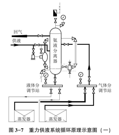 圖3-8所示為重力供液系統(tǒng)循環(huán)原理示意圖,從機房來的高壓氨液經浮球閥進人氨液分離器,然后由氨液分離器的出液管進人蒸發(fā)器。回氣則在氨液分離器內進行氣液分離,然后從吸人管返回壓縮機。氨液分離器與蒸發(fā)器之間可產生程度不同的再循環(huán)。