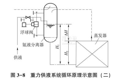 在圖3-8中,氨液分離器與蒸發(fā)器之問,制冷劑的流通(或稱循環(huán))是由液柱壓力差來完成的。液柱靜壓差H1 -H2應足以克服系統(tǒng)的摩擦阻力和局部阻力。當許可時,適當提高氨液分離器液面的相對高度△H并采用流通阻力較小的蒸發(fā)器,對保證系統(tǒng)的正常工作是非常有利的。