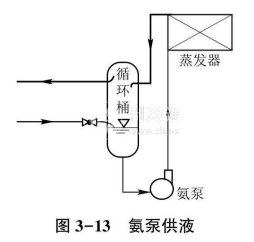 氨泵供液系是利用液泵向蒸發器供液。供液動力來自于液泵,供液動力大,供液量大(為實際蒸發量的3-6倍),制冷效果好;低壓系統需配低壓循環桶、液泵等設備;供液無閃發蒸氣,回氣無液滴,系統運行安全有效;供液穩定,可按負荷要求向蒸發器供液;供液量充分,回流過熱度小,可提高壓縮效率和制冷系數;制冷系統動力增加1%~1.5%,增加運行費用。氨泵供液系統可用于大中型冷庫、人工冰場等,如圖3-13所示。