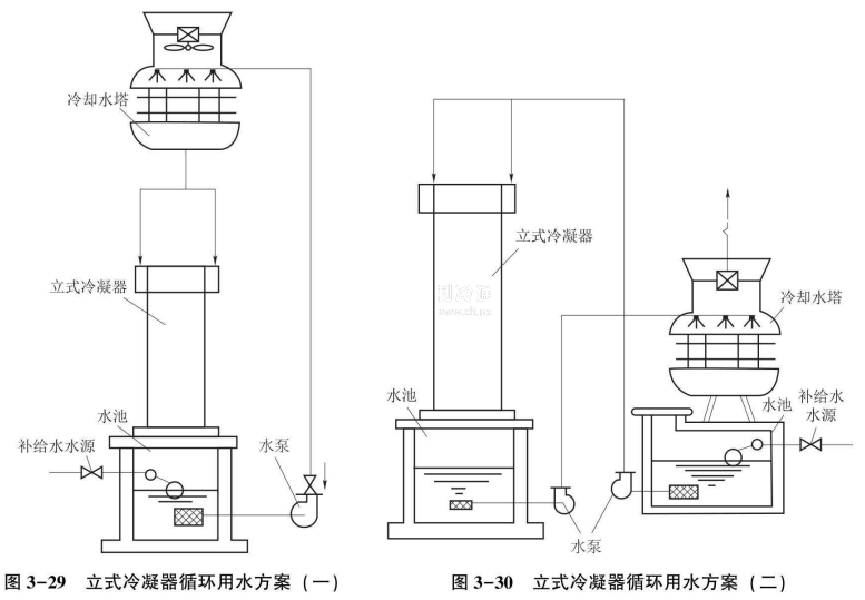 (2)立式冷凝器循環(huán)用水方案。如圖3-29所示,將冷卻塔布置在高于立式冷凝器的地方,只需一個水池、一級循環(huán)泵,即可實現(xiàn)循環(huán)用水。現(xiàn)代冷卻塔用玻璃鋼作外殼,用塑料或鋁板作填料,比較輕巧,故可架設在機房屋頂上。