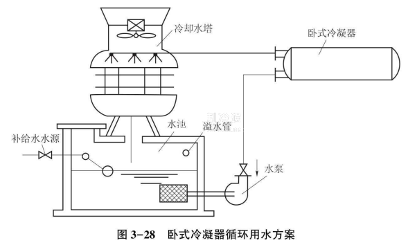 (1)臥式殼管式冷凝器循環(huán)用水方案。圖3-28所示為臥式冷凝器循環(huán)用水方案。采用此方案時,必須注意冷卻水在冷凝器中的溫升應與冷卻塔的降溫能力相適應。一般情況下冷卻塔的降溫能力為2℃~3℃,因此決定冷卻水在冷凝器內(nèi)的溫升時,只能采用與之相適應的溫度。