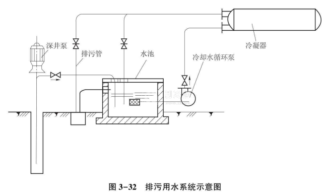 以溫度較低的深井水作為補給水,與部分溫度較高的冷卻水網(wǎng)水混合,作為冷凝器冷卻水,習慣上稱為排污法用水。圖3-32所示為排污法用水系統(tǒng)示意圖,從排污管排放的水債等于補給深井水水量,循環(huán)泵的流量等于計算的冷卻水量。