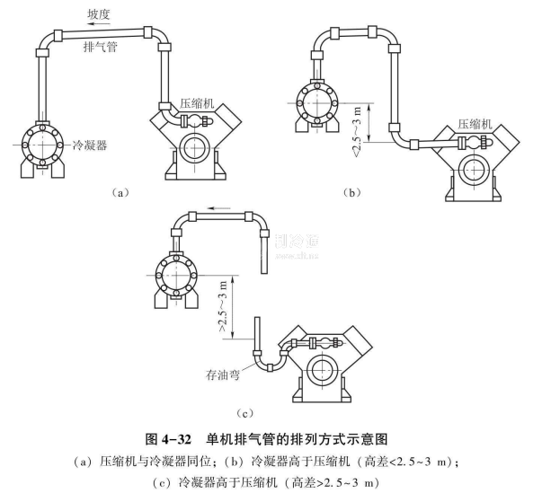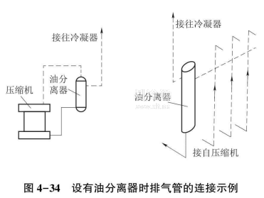 壓縮機(jī)向上排氣立管較長(zhǎng)時(shí),可用如圖4-33所示的方式連接管路。