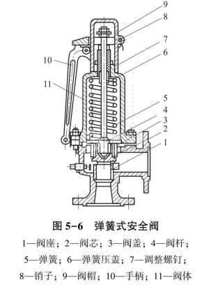 彈簧式安全閥(見圖5-6)主要由閥座、閥桿、彈簧和調(diào)節(jié)螺釘?shù)炔糠纸M成。它是利用彈簧的力量將閥芯壓在閥座上,使承壓容器內(nèi)的壓力保持在允許的范圍內(nèi)。彈簧的力量是通過擰緊或放松調(diào)整螺絲來調(diào)節(jié)的。如果氣體壓力超過了彈簧作用在閥芯上部的壓力,彈簧就被壓縮,閥芯和閥桿被頂起離開閥座,氣體即從排氣口排出。日前,在氨系統(tǒng)的氨泵回路和中間冷卻器中,廣泛應(yīng)用的自動旁通閥是彈簧式安全閥的一種特定形式,也起著安全保護(hù)作用,即當(dāng)壓力超過調(diào)定值時,閥門自動開起,起旁通降壓作用。