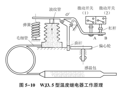 WJ3. 5型溫度繼電器的結構與WT-1226有明顯的區別,但就其工作原理來說大致是相同的。WJ3. 5型溫度繼電器的工作原理如圖5-10所示,其中由感溫包、毛細管、波紋管所組成的感溫機構,對杠桿產生一個頂力矩,此頂力矩與彈簧產生的拉力矩相平衡。若被測介質的溫度低于調定值,由于頂力矩小于拉力矩而使杠桿以。為支點逆時針方向轉動,杠桿將微動開關按下,可以切斷電源,停止電磁閥供液;反之,若被測介質溫度上升,則動作過程相反,使微動開關復位,電磁閥電路導通,電磁閥開通供液。