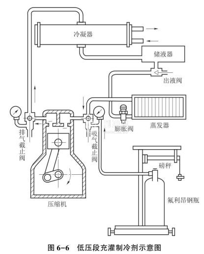 (3)氟利昂是以濕蒸氣形式充入的,所以打開鋼瓶閥時開度要恰當,以防壓縮機發生液擊,同時旋開壓縮機吸入閥的多用孔道,開始充灌制冷劑。若系統內呈真空狀況,則鋼瓶內的制冷劑就會自動注入系統,待系統內壓力與鋼瓶內壓力平衡時,制冷劑停止進入。這時若系統內制冷劑量還未加足,則可先關閉鋼瓶閥、儲液器出液閥、膨脹閥和壓縮機的吸入閥,啟動冷凝器的冷卻水泵,然后啟動壓縮機。為了防止液擊沖缸,應慢慢開啟吸入閥,把系統內的制冷劑都抽入儲液器,系統低壓部分又被抽成真空,然后打開鋼瓶閥,讓制冷劑再次自動灌入系統。如此反復進行,直至加足系統所需的制冷劑量;也可以在系統再次抽成真空后,打開儲液器出液閥和小開膨脹閥,讓系統正常運行,然后打開鋼瓶閥,并逐漸關小吸入閥(即開啟多用孔道),讓鋼瓶內的制冷劑依靠瓶內壓力與吸入壓力之差流入系統(應注意不能產生液擊)。當充注到滿足要求時,應馬上關閉鋼瓶閥,然后讓接管中殘留的制冷劑盡可能被吸入系統,最后關閉多用孔道,停止壓縮機運行,充注制冷劑工作基本結束。