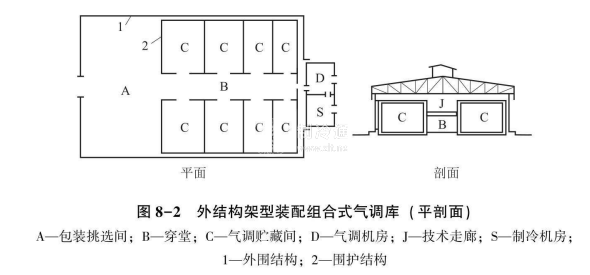圖8-2所示為較典型的氣調庫主體構造示意圖,地坪以上建筑包括外圍結構和圍護結構兩部分。外圍結構由鋼柱、鋼梁等組合的鋼結構架和屋面板、外圍板等組成;圍護結構即庫體,由“三明治”板裝配而成。外圍結構主要起保護圍護結構的作用,并能改善圍護結構的熱工性能;圍護結構則具有隔熱和氣密的功能。