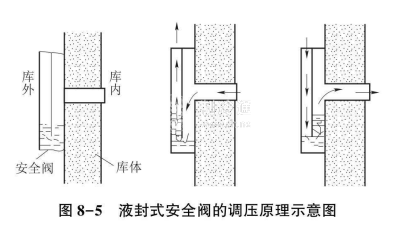 當庫內溫度波動產生的庫內外壓差較大時,調壓氣袋已無能為力,要由安全閥來實現。安全閥由內腔和外腔組成,內腔與庫內相通,外腔與大氣相通。在未充注封閉液體時,內外腔連通;當充注一定液柱高度的液體后,液體將內外腔隔斷。安全閥的調壓原理如圖8-5所示,這種安全閥稱為液封式安全閥。還有機械式安全閥,其作用原理類似壓縮機的吸、排氣裝置。