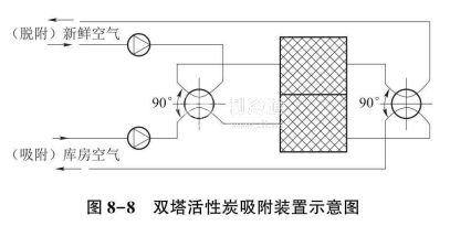 脫除二氧化碳的裝置很多,有吸收裝置、吸附裝置等。吸收裝置在早期的氣調庫中使用較多,但因存在這樣或那樣的缺陷,已被逐步淘汰,目前常用的是吸附裝置。