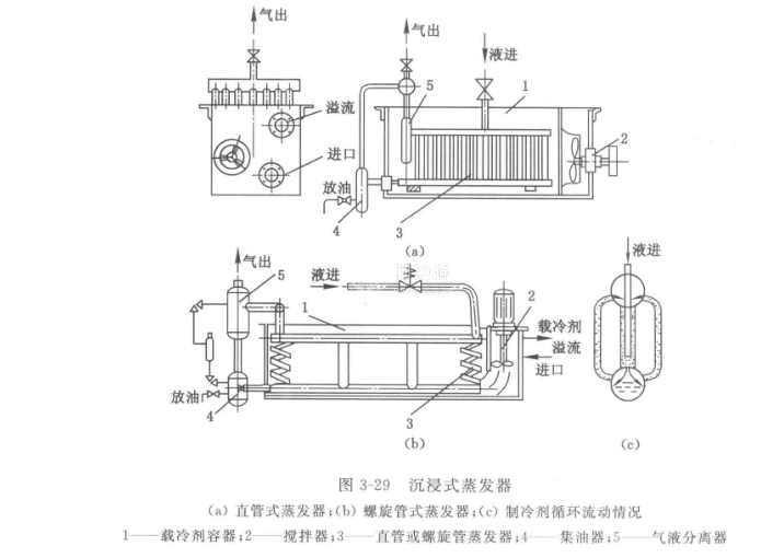核心提示:沉浸式蒸發器是由一組垂直布置的平行管組成的蒸發器,如圖3-29所示。制冷劑在管內蒸發,整個組沉浸在盛滿載冷劑的箱(池或梢)體內,載冷劑在攪拌器的推動下在箱內流動以增熱。