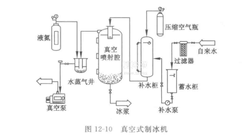真空制取冰漿的裝置如圖12-10所示,包括真空霧化腔室、供水系統和抽真空系統。真空式制冰機將水霧化噴入真空絕熱腔室,在水滴表面形成的水蒸氣被連續地抽出。水蒸氣從水滴中吸收蒸發潛熱,從而使水滴溫度平穩地下降,直至水滴形成冰晶。冰漿的IPF可通過改變真空腔室的真空度和噴嘴的數目實現,霧化噴嘴平均直徑為50 um,噴射角為60°,在噴射壓力為810 kPa下的噴射流量為2-10 L/h,真空腔室高1.33m,以致水滴在腔室內停留的時間不超過0.002 s,制冰所用的水為含7%乙烯的乙二醇水溶液。