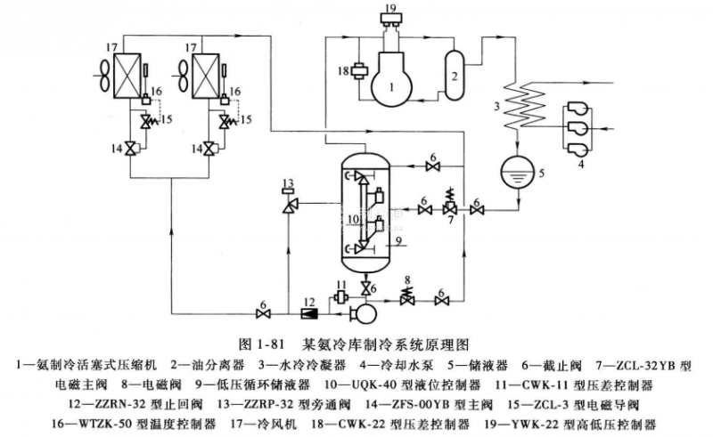 圖1-81所示為某氨冷庫制冷系統原理圖,該系統分為吸排氣與回油回路(壓縮機與油分離器)、冷凝與儲液回路(水冷冷凝器、冷卻水泵和儲液器)、氨泵供液回路(低壓循環儲液器、氨泵和各種控制器)和蒸發回路(冷風機、溫度控制器和控制閥門)。系統中制冷劑循環如圖1-81所示。