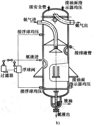 進氣管從桶體頂部封頭伸入桶內,一直往下浸沉在正常氨液面下150~200mm,以保證低壓排氣能充分被洗滌冷卻。進氣管下端開口并焊有底板,以避免進氣直接沖擊桶底,將潤滑油沖起。桶上部兩塊多孔傘形擋板可分離蒸氣中的液滴。進氣管液面以上的管壁上開有一個壓力平衡孔,它可以避免停機時氨液進入氨氣管道。已冷卻的氨蒸氣從上部側面的出氣管去高壓壓縮機。一組蛇形盤管設置于桶體下部,從儲氨器來的高壓氨液被管外中間溫度的氨液冷卻而獲得過冷。桶上排液管與排液桶或低壓循環儲液器連接。桶上還有放油管、壓力表、安全閥及液位計等各種管接頭。