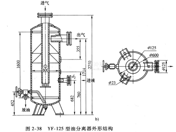 在進氣管的外側上部還裝有多孔傘形擋板,起到分離液滴之用。筒體下部側面設有放油管接頭,與集油器相連。傘形擋板之上的筒體側面設有出氣管接頭,并使出氣管伸入筒內一定的長度,且引出口是朝上開的,其目的是使氨氣在排出分離器以前再折流一次,有助于提高分離效果。直立圓筒形筒體和上、下兩個橢圓形封頭焊成一體,上封頭中心伸入一支進氣管直至筒體下部,并浸在液氨液面以下,開口處有一擋板,防止氣流直沖器底,而由徑向開口流出,經液氨洗滌后,較純凈的氨氣向上流,經多孔擋板又一次接觸分離之后,由筒體上部的側向出氣管排出。在筒體中部有供液氨接管,底部有放油閥。