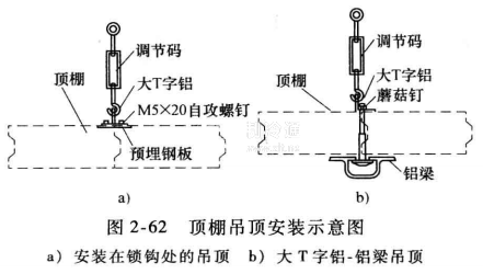 對于需要吊頂的冷庫,可采用專配的吊鉤安裝在鎖鉤處,用來吊住頂棚,每個吊鉤可承受980N拉力(吊鉤自行用調節碼調整),亦可用大T字鋁一鋁梁吊頂,每米可承受3920~5880N拉力,如圖2-62所示。