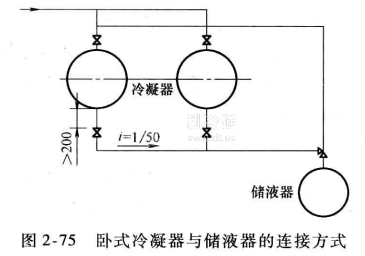 (1)臥式冷凝器至儲液器的液體管道 管道內的液體流速不應超過0. 5m/s,水平件段的坡度為1/50,坡向儲液器。冷凝器至儲液器之間的閥門,應安裝在距離冷凝器下部出口處不少于200mm的部位,其連接方式如圖2-75所示。