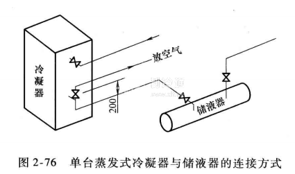 冷凝器至儲液器的液體是靠液體重力流入的,為防止冷凝器排出液體時出現高液位現象,冷凝器與儲液器之間應保持一定的高度差,其連接的管道要保持一定的坡度。