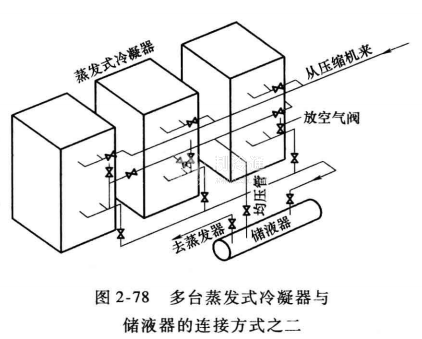為防止由于各臺(tái)冷凝器內(nèi)的壓力不一致而造成冷凝器出液回灌入壓力較低的冷凝器中,液體出口的立管段應(yīng)留有足夠高度,以平衡各臺(tái)冷凝器之間的壓力差和抵消排管的壓力降。液休總管進(jìn)入儲(chǔ)液器前向上彎起作為液封。冷凝器液體出口與儲(chǔ)液器進(jìn)液水平管的垂直高度應(yīng)不少于600mmo液體管內(nèi)的液體流速不應(yīng)大于0. 5m/s,并有1/50的坡度坡向儲(chǔ)液器。冷凝器與儲(chǔ)液器應(yīng)安裝均壓管,其連接方式如圖2-77所示。